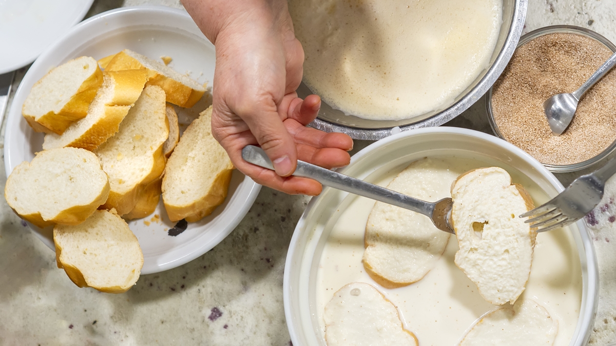 - Passe cada fatia de pão nessa mistura, deixando absorver levemente.
