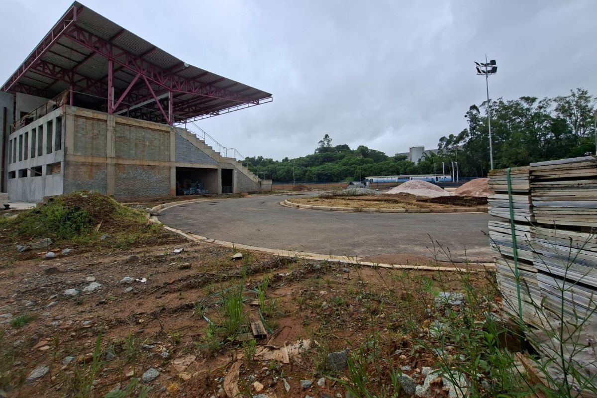 Obra de pista de atletismo, arquibancada e vestiários abandonada há nove meses abriga colônias de morcego, com materiais ao ar livre