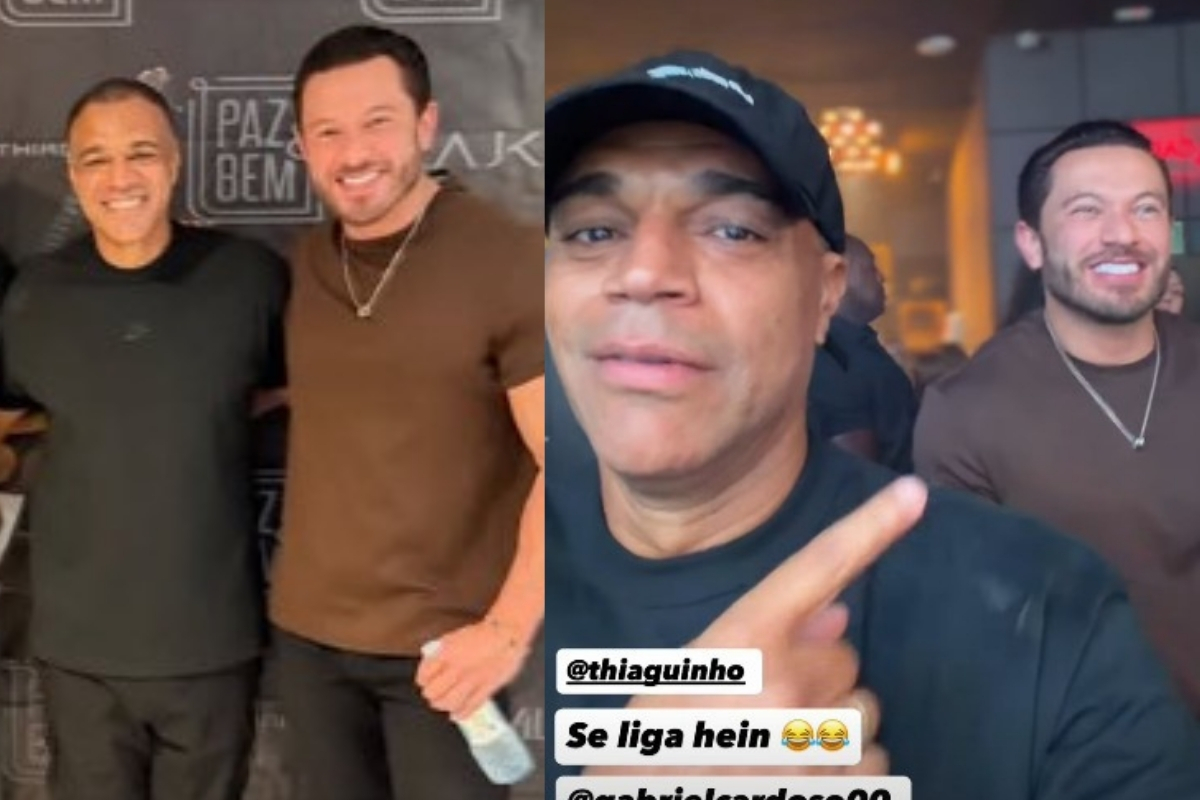 Gabriel Cardoso, atual affair de Gracyanne Barbosa, surgiu ao lado de Denílson, ex-jogador de futebol que já foi desafeto de Belo