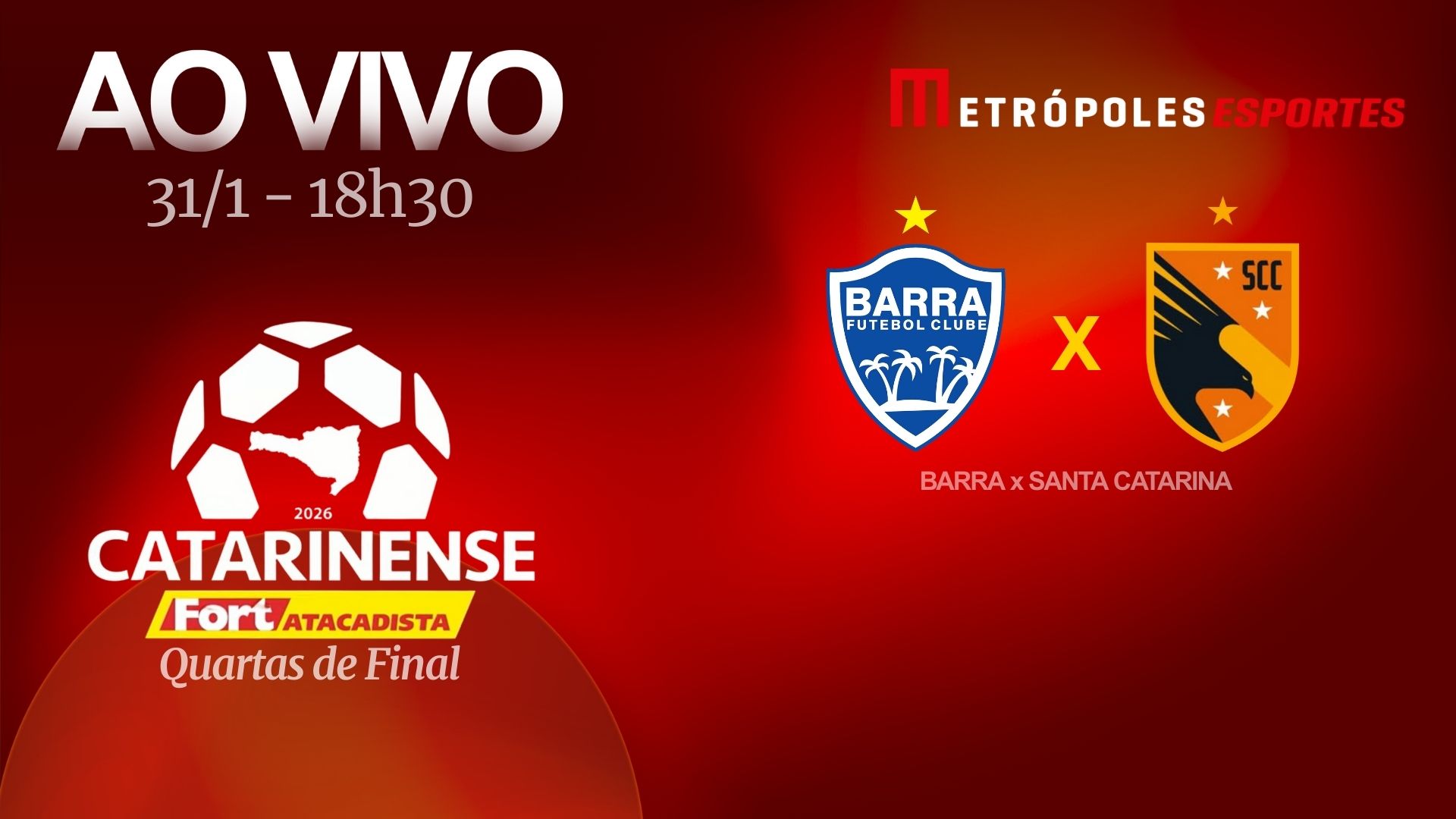 Partida é válida pela ida das quartas de final do Catarinense Fort Atacadista 2026 e terá transmissão ao vivo pelo Metrópoles Esportes