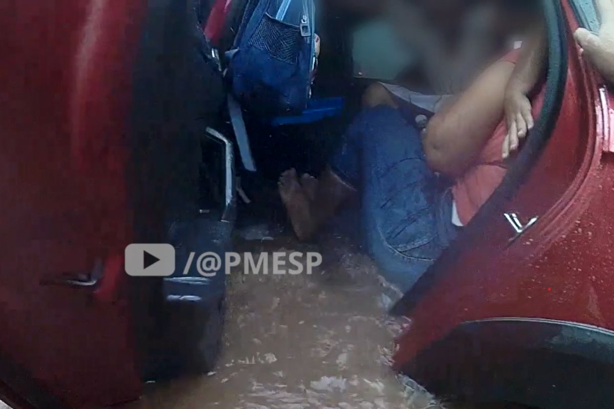 Segundo a PM, a força da água tomou a via e arrastou o carro da família que estava ilhada no local. Todos foram resgatados sem ferimentos
