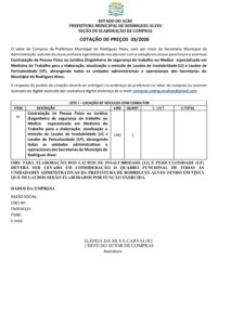 O setor de Compras da Prefeitura Municipal de Rodrigues Alves, vem por meio da Secretaria Municipal de Administração solicitar de vossa senhoria a gentileza de nos atender com a cotação em anexo para futura e eventual Contratação de Pessoa Fisica ou Juridica (Engenheiro de segurança do trabalho ou Medico especializada em Medicina do Trabalho para a elaboração, atualização e emissão de Laudos de Insalubridade (LI) e Laudos de Periculosidade (LP), abrangendo todas as unidades administrativas e operacionais das Secretarias do Município de Rodrigues Alves.