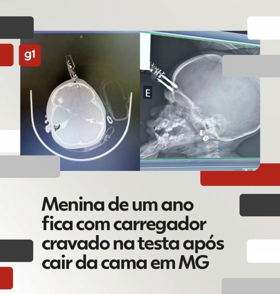 Uma menina de 1 ano passou por uma cirurgia de urgência após cair da cama e ter um carregador de celular cravado na testa, em Divinópolis. Ela segue internada, em observação, sem sinais de sequelas neurológicas até o momento, segundo o médico responsável pelo atendimento, o neurocirurgião Bruno Castro.