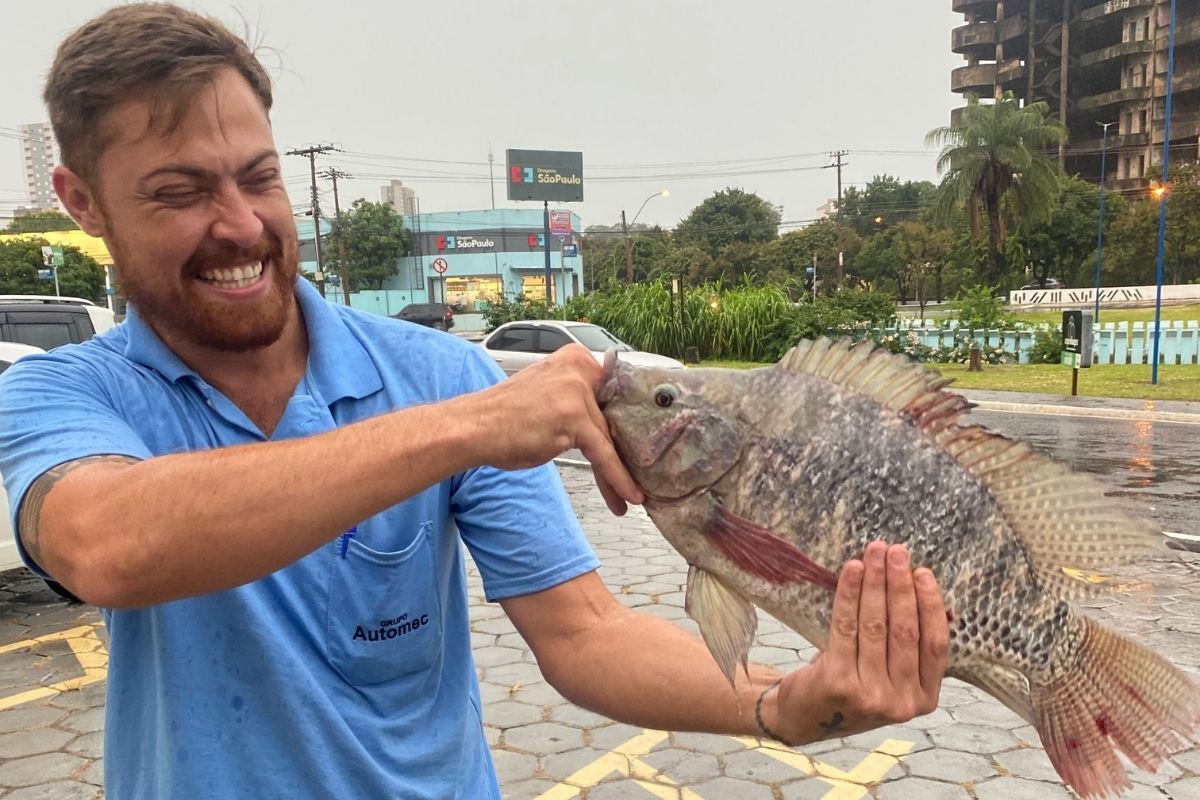 A tilápia foi parar no meio da Avenida Ismael Alonso y Alonso, em Franca, após a chuva ter causado o transbordamento do Córrego Cubatão