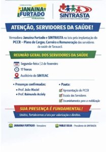 A Vereadora Janaina Furtado, em parceria com o Sindicato dos Trabalhadores da Saúde – SINTRASTA, reafirma seu compromisso de representar os servidores municipais da saúde junto à Prefeitura de Tarauacá nas principais bandeiras de luta do ano de 2026, tendo como prioridade absoluta a implantação do PCCR – Plano de Cargos, Carreira e Remuneração da categoria.