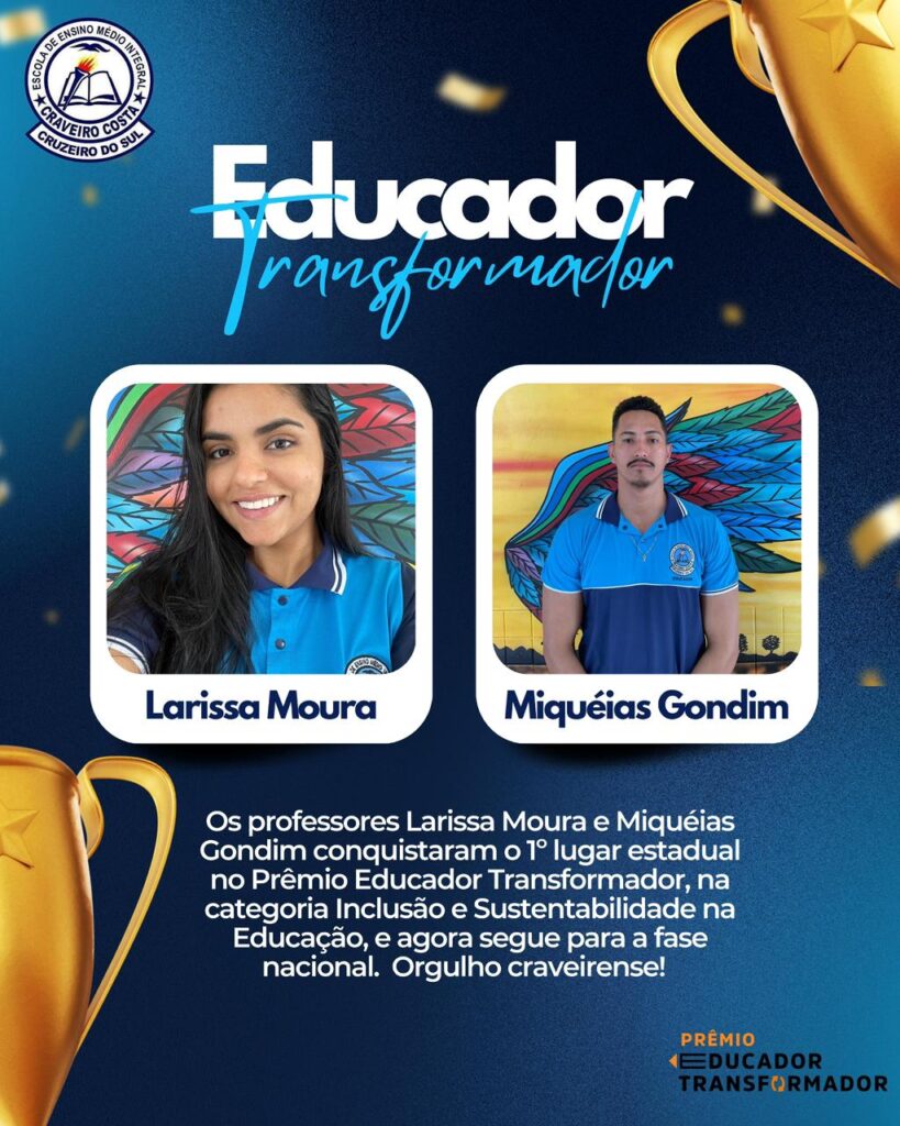 Os professores Larissa Moura e Miquéias Gondim, da Escola Estadual de Ensino Integral Craveiro Costa, alcançaram o 1º lugar no Acre no Prêmio Educador Transformador, na categoria Inclusão Social e Sustentabilidade na Educação. A conquista coloca a escola de Cruzeiro do Sul em destaque no cenário educacional e garante aos educadores uma vaga na etapa nacional da premiação.