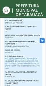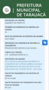Uma viagem a Brasília (DF), capital federal, realizada pelo prefeito de Tarauacá, Rodrigo Damasceno, juntamente com o secretário de Comunicação, Dilvo Bareta, o assessor especial Assis Souza, o diretor Lucas Rhavanely e o procurador jurídico Itálo Feltrini, custou aos cofres públicos do município o total de R$ 84.552. Somente no mês de janeiro de 2026, justamente quando o Congresso Nacional está de recesso.