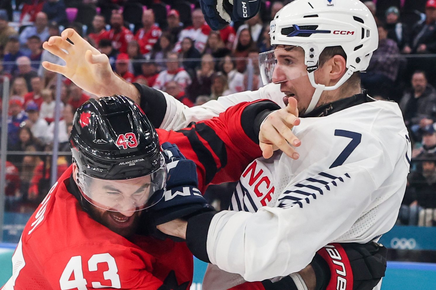 Pierre Crinon e o canadense Tom Wilson brigaram em uma partida de hóquei nas Olimpíadas. Ele foi punido pela Federação Francesa de Hóquei