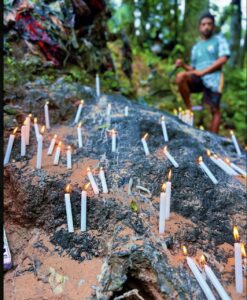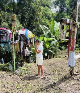 Ao lado da casa, à beira do rio, encontra-se o túmulo — a sepultura de dois irmãos. Lugar santo. Solo de reverência. É ali que velas são acesas, que roupas, cabelos, cordões e outras ofertas são depositadas. A chama tremula das velas parece conversar com o vento, como se levasse aos céus as súplicas e gratidões.
