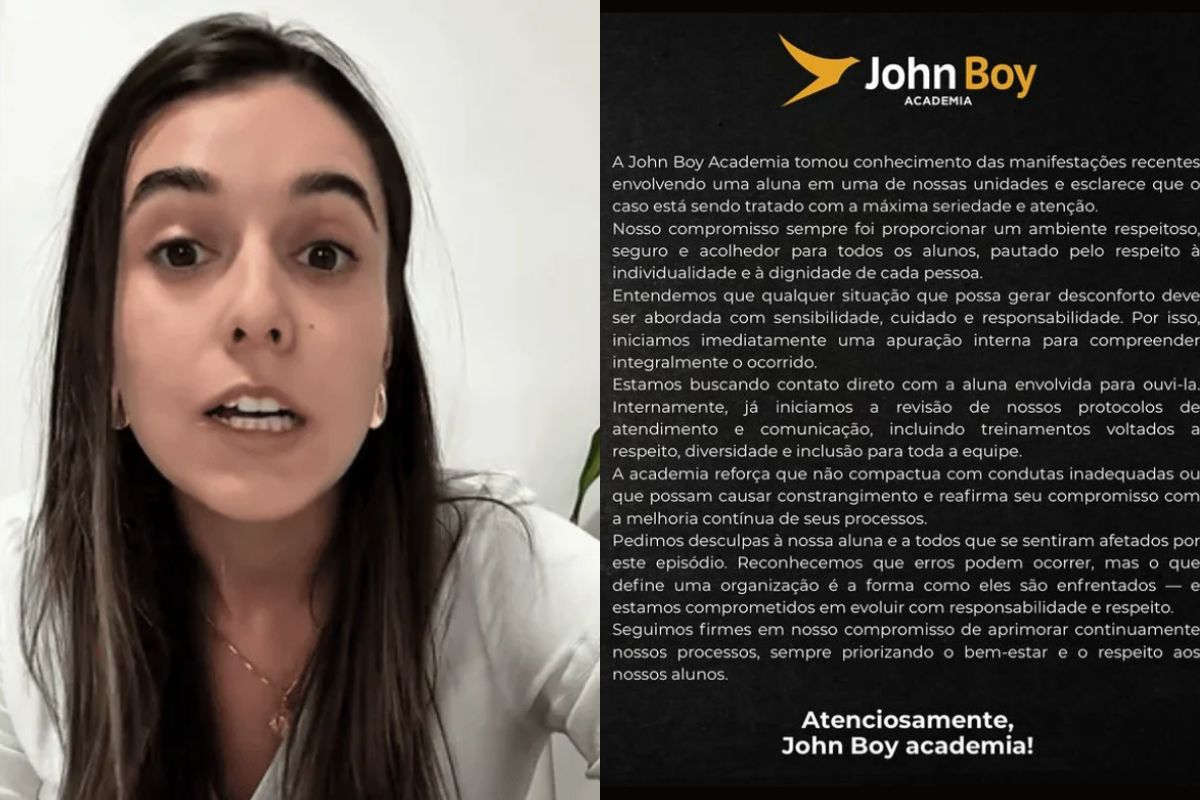 Compartilhar Facebook Twitter Email Copy Link WhatsApp A John Boy Academia, de São José dos Campos, diz que abriu uma apuração interna após o caso. “Revoltante”, diz engenheira Fonte: