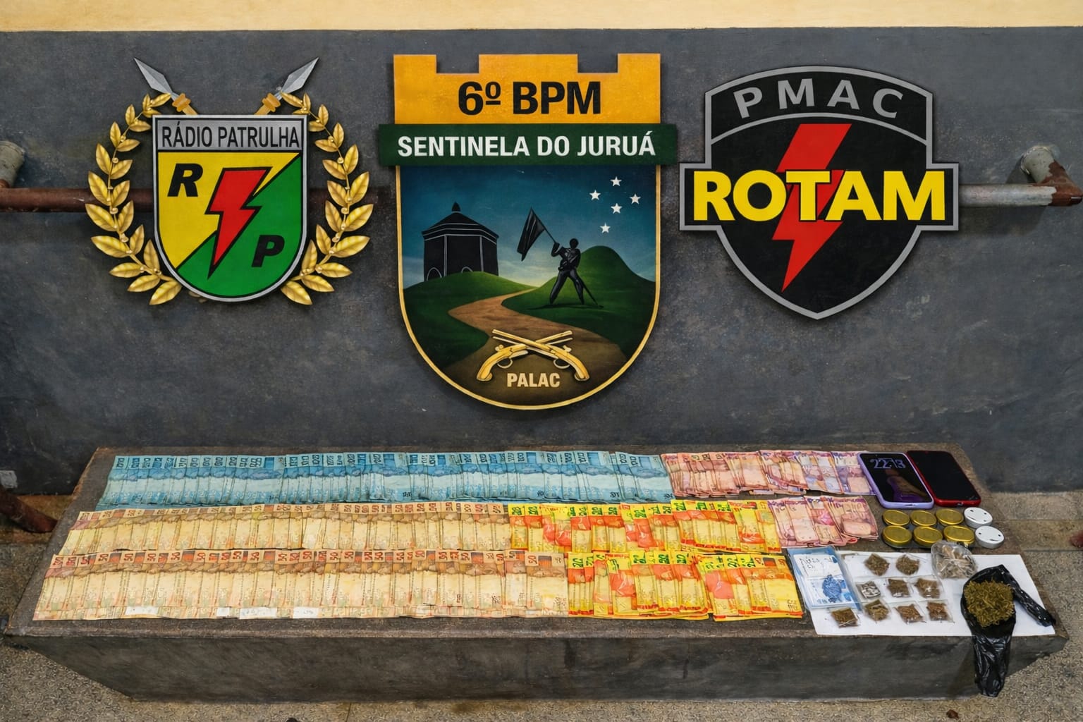 Dentro da residência, Amanda foi flagrada tentando esconder dinheiro e porções de maconha prontas para venda. No local, os policiais também apreenderam 13 caixas de espoletas, esferas de chumbo, celulares, joias e um veículo SpaceFox vermelho, apontado por moradores como usado em crimes na cidade.