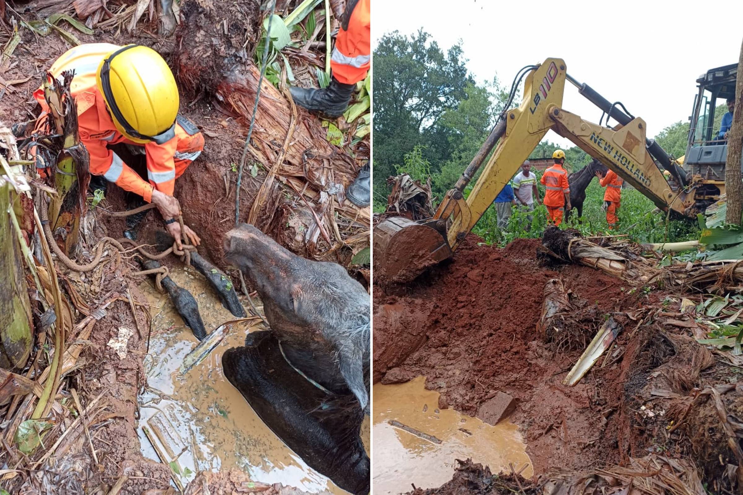 Compartilhar Facebook Twitter Email Copy Link WhatsApp Animal ficou preso e precisou de retroescavadeira para ser retirado; segundo os bombeiros, não houve ferimentos graves Fonte: