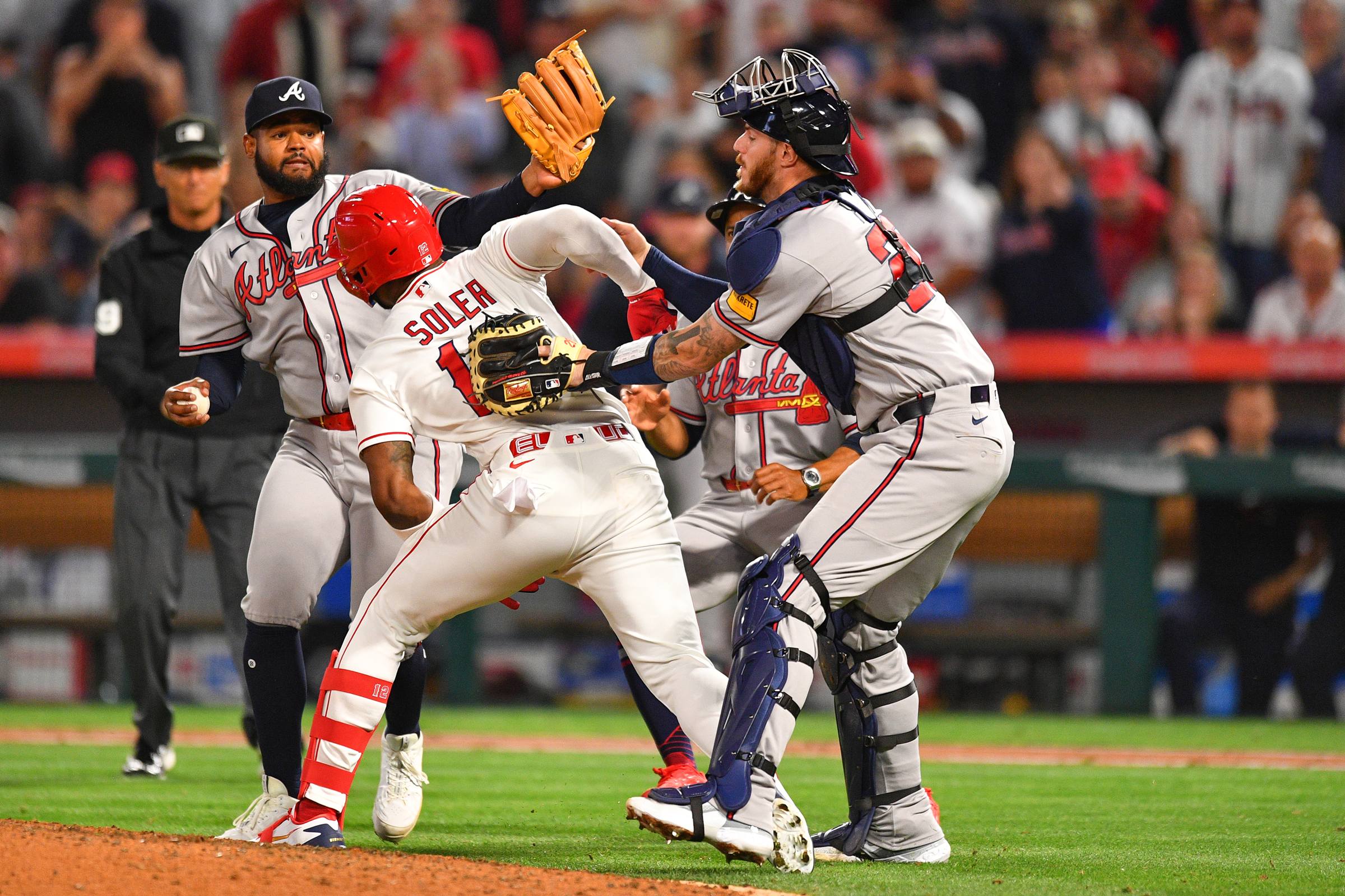 Compartilhar Facebook Twitter Email Copy Link WhatsApp Soler, dos Angels, e López, dos Braves, trocaram socos em campo e foram expulsos da partida Fonte: