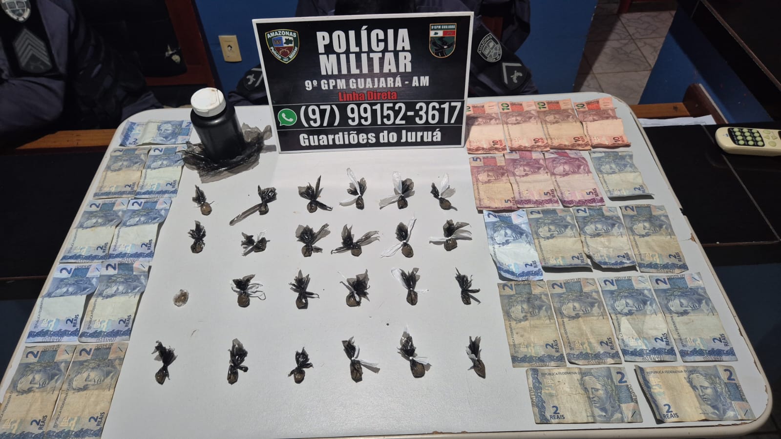 De acordo com a ocorrência, a guarnição recebeu denúncia de que C. S. da Silva, de 45 anos, estaria comercializando entorpecentes em via pública. A equipe se deslocou até o local, de difícil acesso por ficar às margens do rio, sendo necessário deixar a viatura em um ponto estratégico e seguir a pé.